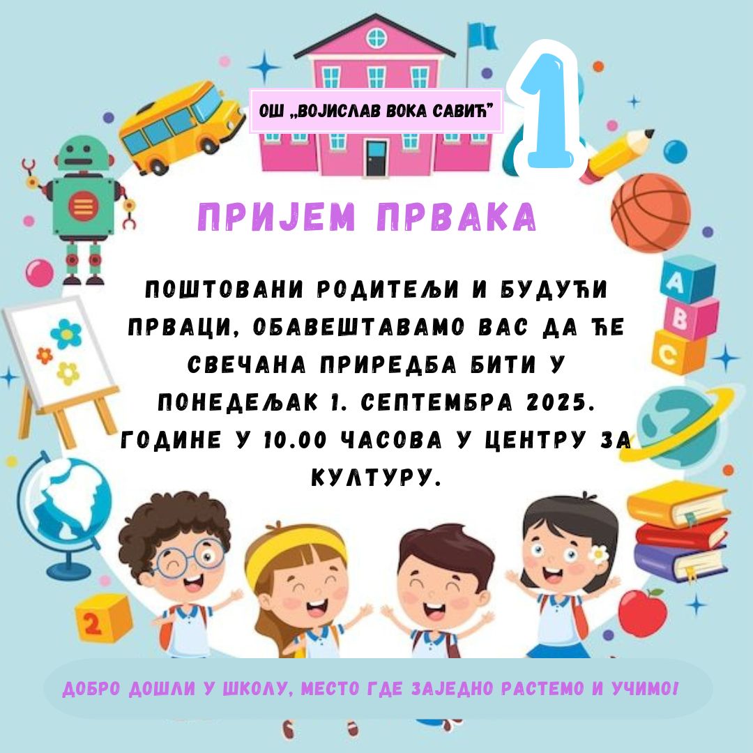 За ученике првог разреда биће одржана свечана приредба у понедељак 1. септембра 2025. године у Центру за културу у 10.00 часова. По завршетку приредбе, прваци са родитељима, односно другим законским заступницима, долазе у школу где ће их сачекати њихове учитељице.