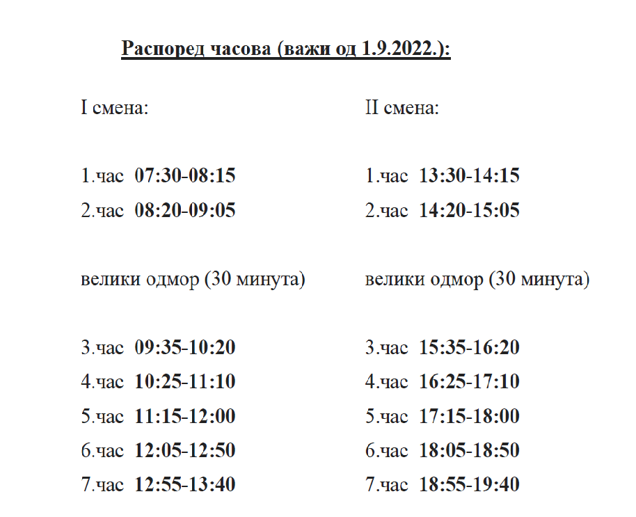 Настава у првој смени почиње у 7.30, а у другој смени почетак наставе је у 13.30 часова.
