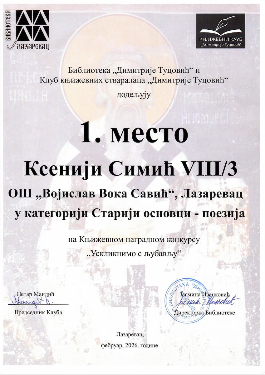 ПРВА НАГРАДА НА СВЕТОСАВСКОМ ЛИТЕРАРНОМ КОНКУРСУ Ксенија Симић, ученица 8. разреда наше школе, у оквиру Литерарне секције „Разиграно перо”, написала је песму „Свети Сава” са којом је учествовала на Књижевном наградном конкурсу „Ускликнимо с љубављу” Библиотеке „Димитрије Туцовић” и Клуба књижевних стваралаца „Димитрије Туцовић” и у конкуренцији ученика из целе Србије освојила прву награду у категорији Старији основци - поезија. Представљање победника и додела награда одржани су у Свечаној сали Библиотеке ,,Димитрије Туцовић" у Лазаревцу 4. марта 2026. Ксенији су подршку пружили менторка, наставница Лидија Марић Јовановић, родитељи и брат..