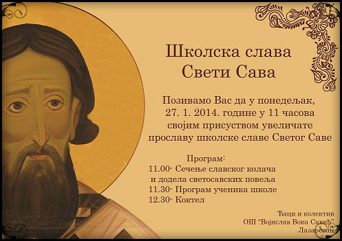 Свечано у духу традиције Српског народа, прославили смо школску славу Светог Саву. У присуству великог броја ученика и радника наше школе, заједно са свештеницима наше цркве, извршили смо обред ломљења славског колача. Овогодишњи домаћин славе је наставник српског језика Мирослав Рабреновић.