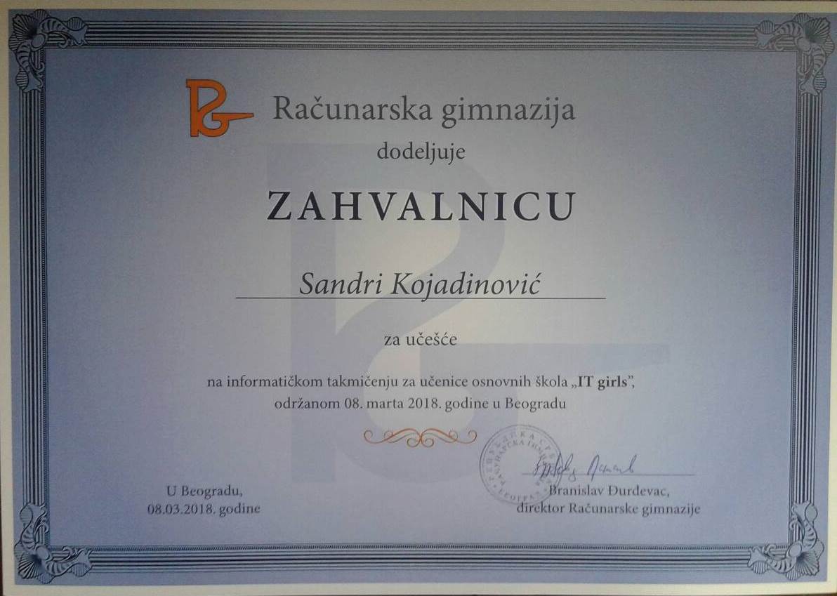 У Рачунарској гимназији је у четвртак, 8. марта одржано треће по реду финале такмичења "IT Girls", чији циљ јесте промовисање информатике међу женском популацијом, Учеснице такмичења су биле ученице 7. и 8. разреда основних школа, а међу њима и ученица наше школе Сандра Којадиновић. Такмичарке су се надметале у изради Web сајтова на тему "Хоби". Све учеснице добиле су сертификат о учешћу и књигу издавачке куће Portalibris. Заиста једно лепо такмичење и ново искуство за нашу Сандру!