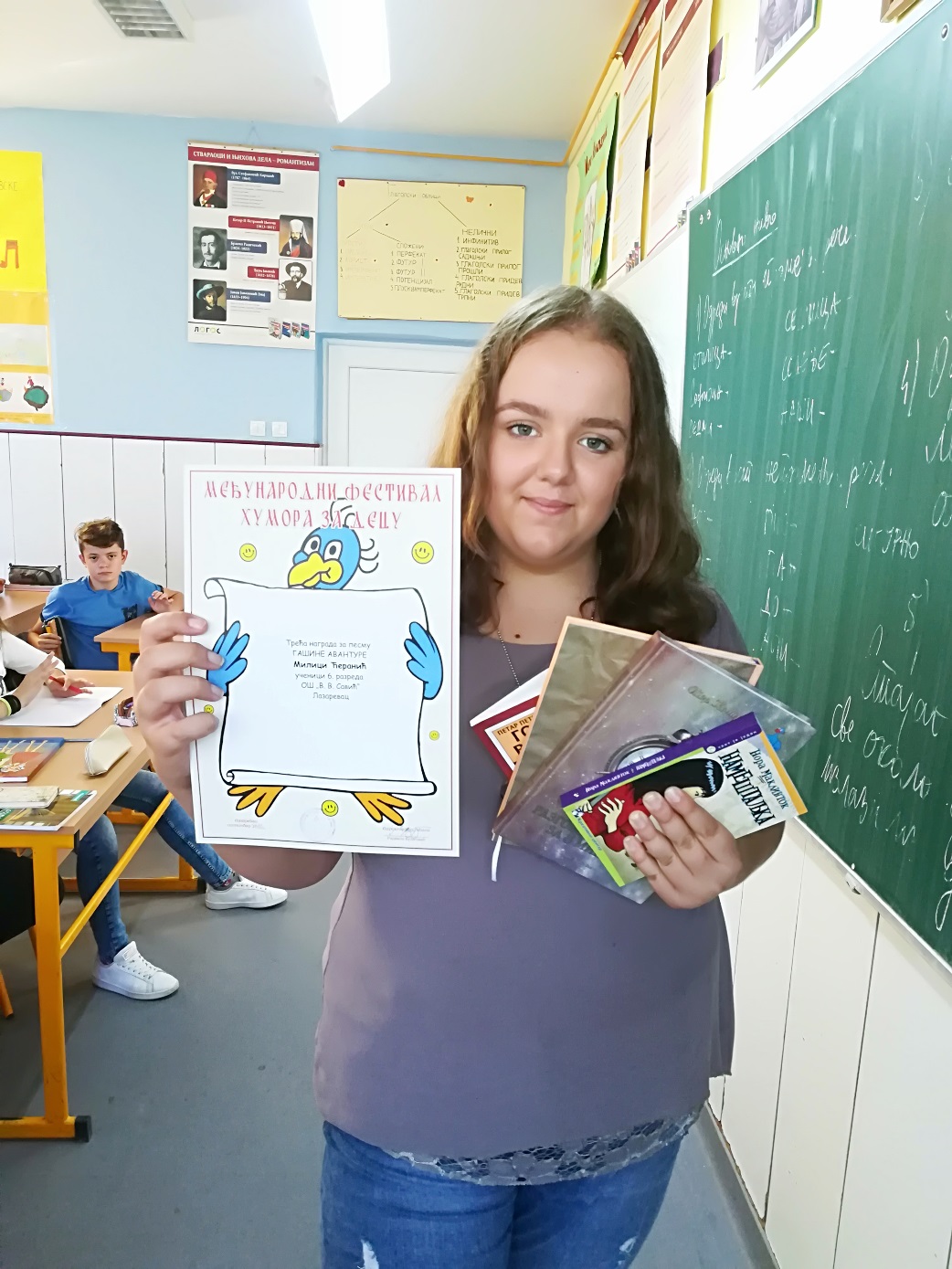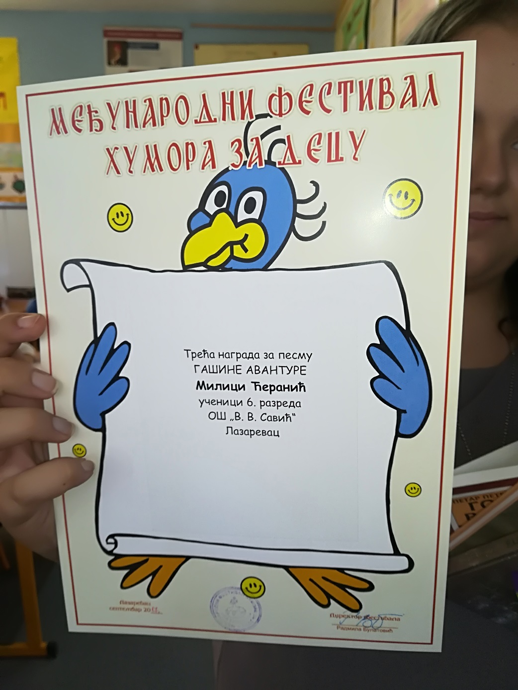 Милица Ћеранић, ученица 7/4 одељења, написала је песму Гашине авантуре и освојила 3.награду на Фестивалу хуморае. Браво за нашу Милицу!