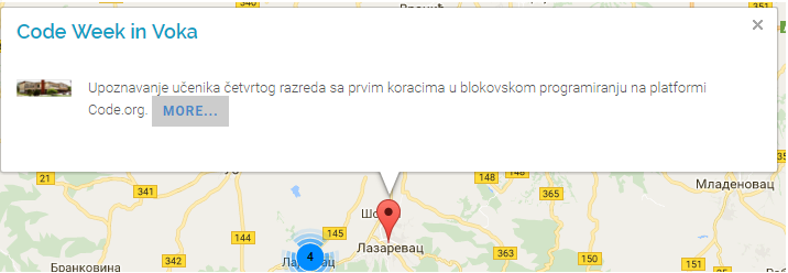 Ове године наша школа је по трећи пут узела учешће у Европској недељи програмирања (EU Code Week 2017), која се иначе одржава по пети пут. По први пут у нашој школи су део овог догађаја били ученици четвртог разреда. У среду, 11. октобра, ученици IV-2 одељења учитељице Љиљане Милановић су се упознали са предметом Информатика и рачунарство и наставницом Слађаном Маченовски. Након упознавања са садржајима који ће изучавати у петом разреду ученици су направили своје прве кораке у блоковском програмирању на платформи code.org. Више о овом догађају прочитајте на блогу предмета Информатика и рачунарство кликом на следећи линк. Вока информатика