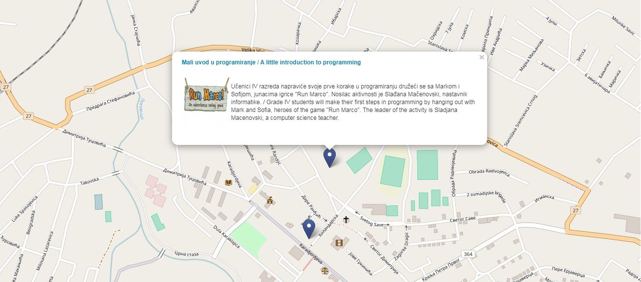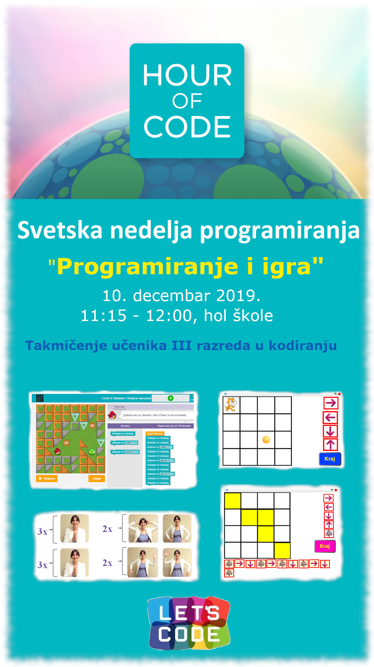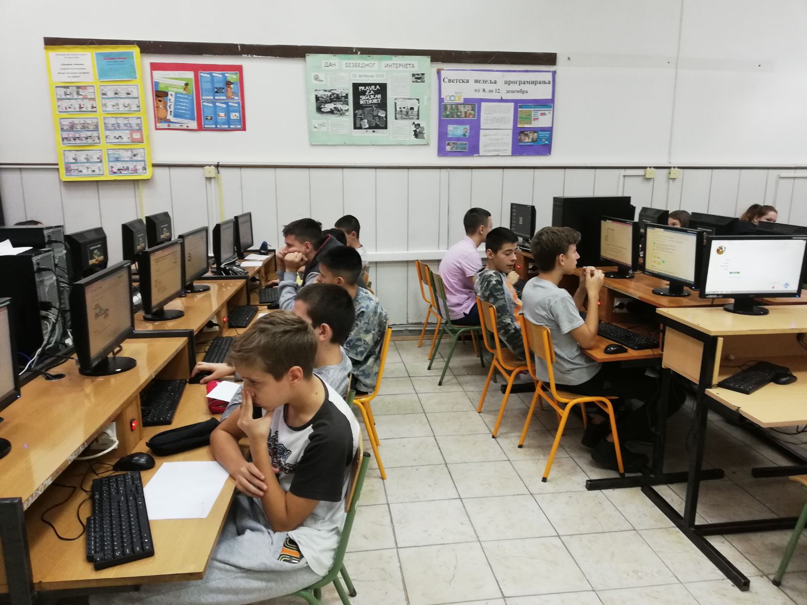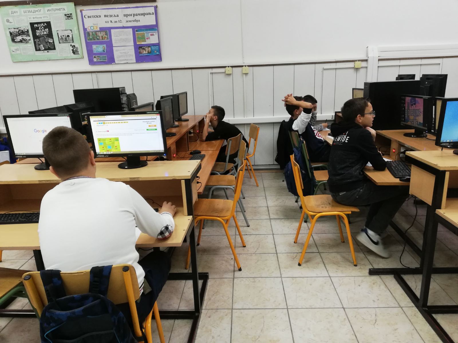 Наставница информатике и рачунарства, Слађана Маченовски је у дигиталном кабинету 8. октобра ученике IV-1 и 15. октобра ученике IV-2 и IV-3  покушала да кроз игру и забаву уведе у магични свет програмирања. Ученици су се дружили са Марком и Софијом, јунацима познате игрице Run Marco. Ученици су писањем својих првих кодова помогали поменутим ликовима да стигну на жељено одредиште на свом путу око света.
