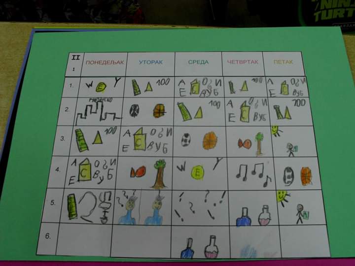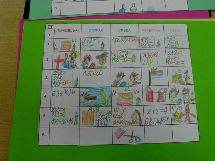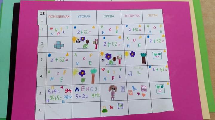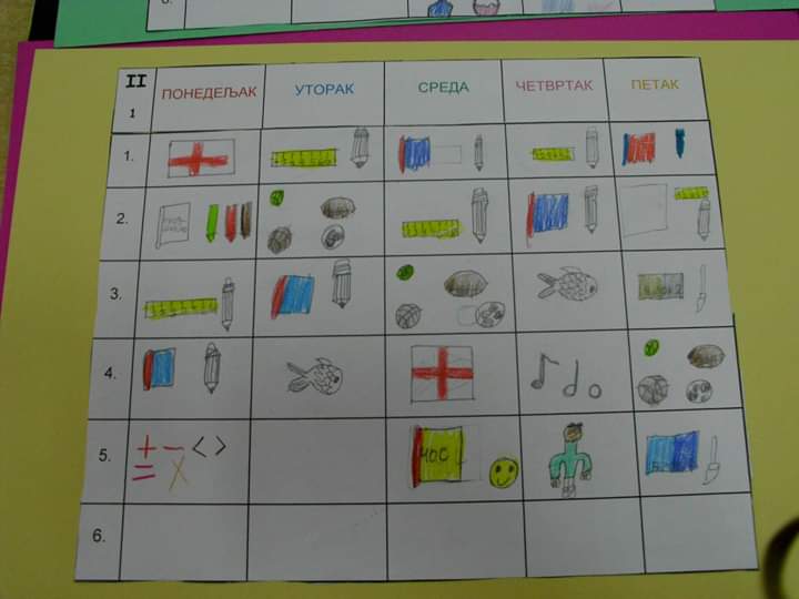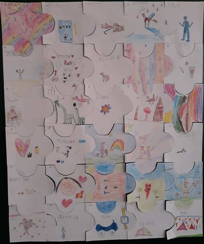 У септембру смо радили пројекат Одељенска слагалица. На белом хамеру сам нацртала слагалицу и исекла делове. Сваки ученик је добио један део на коме је написао своје име.  Затим су добили задатак да свако од њих устане и исприча нешто о себи, шта воли, а шта не и сл. Остали су пажљиво слушали. Ученици су у паровима, између себе поновили о својим интересовањима, а затим је уследила размена делова слагалице. Размењивали су се парови. Свако је добио задатак да код куће нацрта нешто свом пару, на основу онога што је сазнао о њему. Ученици су донели своје делове, испричали шта су нацртали и због чега и дали слагалицу другу. Све делове смо спојили и залепили на зелену таблу и тако добили једну целину,која нам краси учионицу.