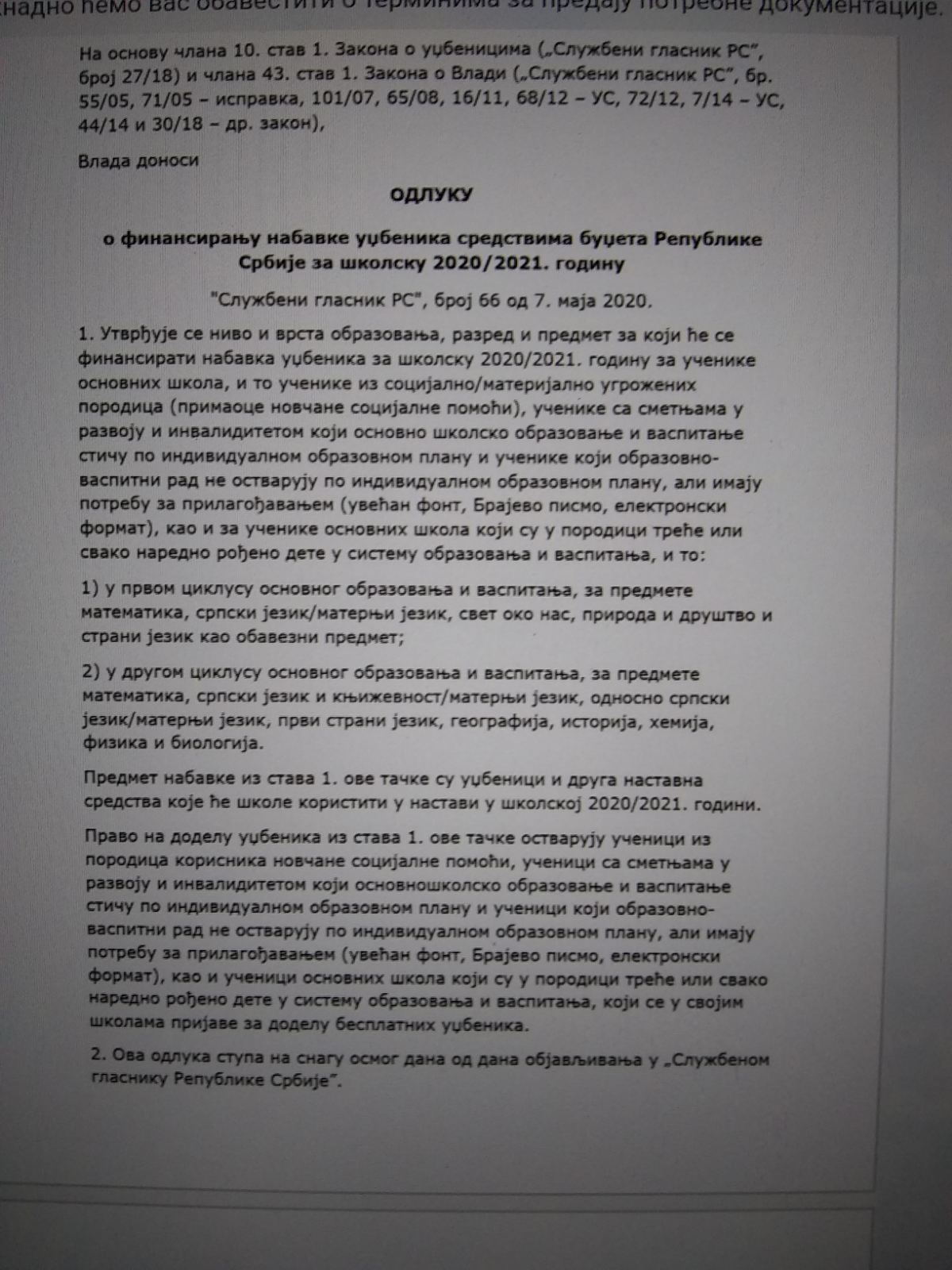 Обавештење о финансирању набавке уџбеника средствима буџета Републике Србије за школску 2020/2021. годину