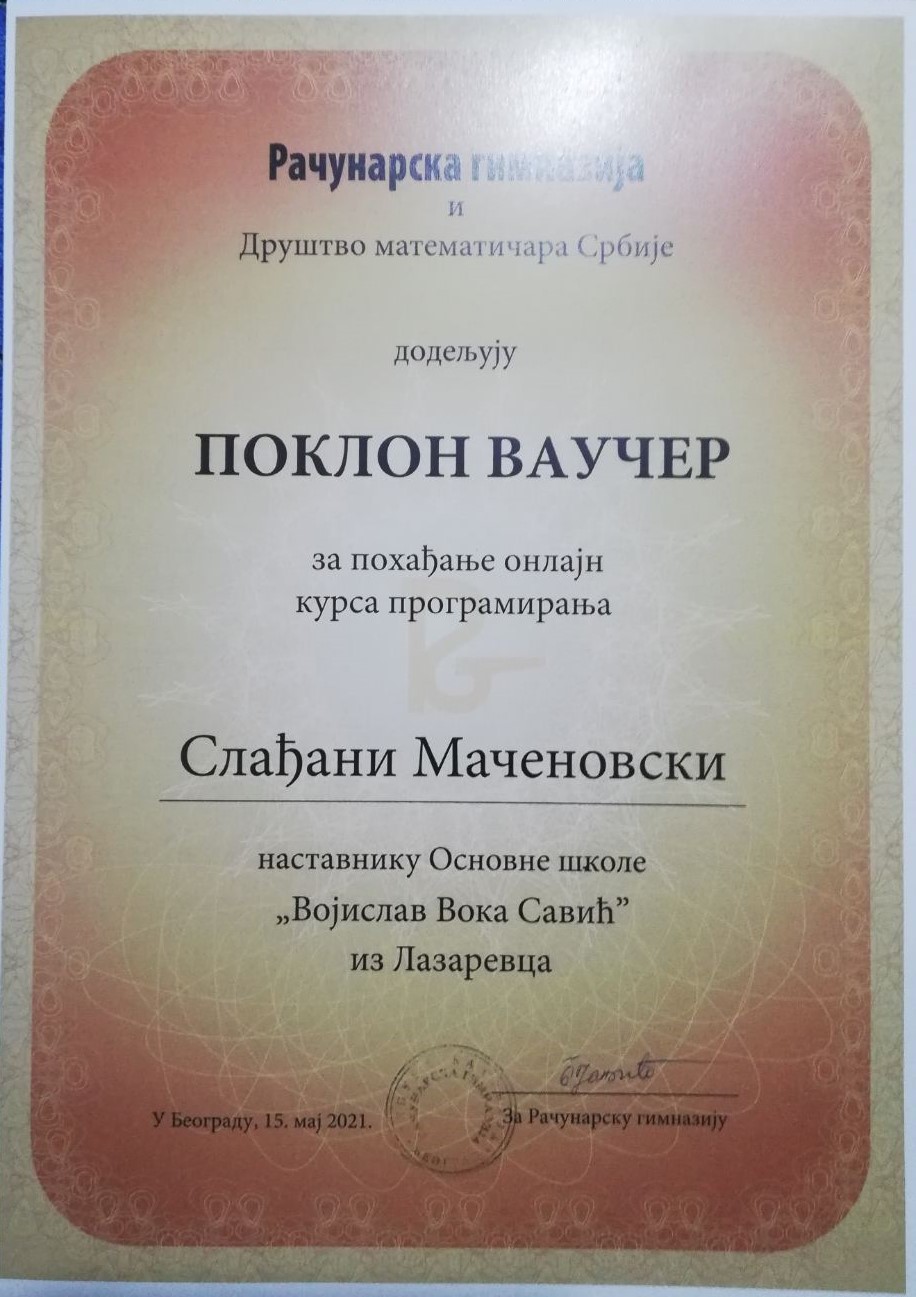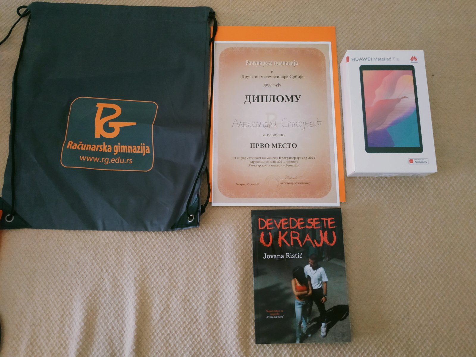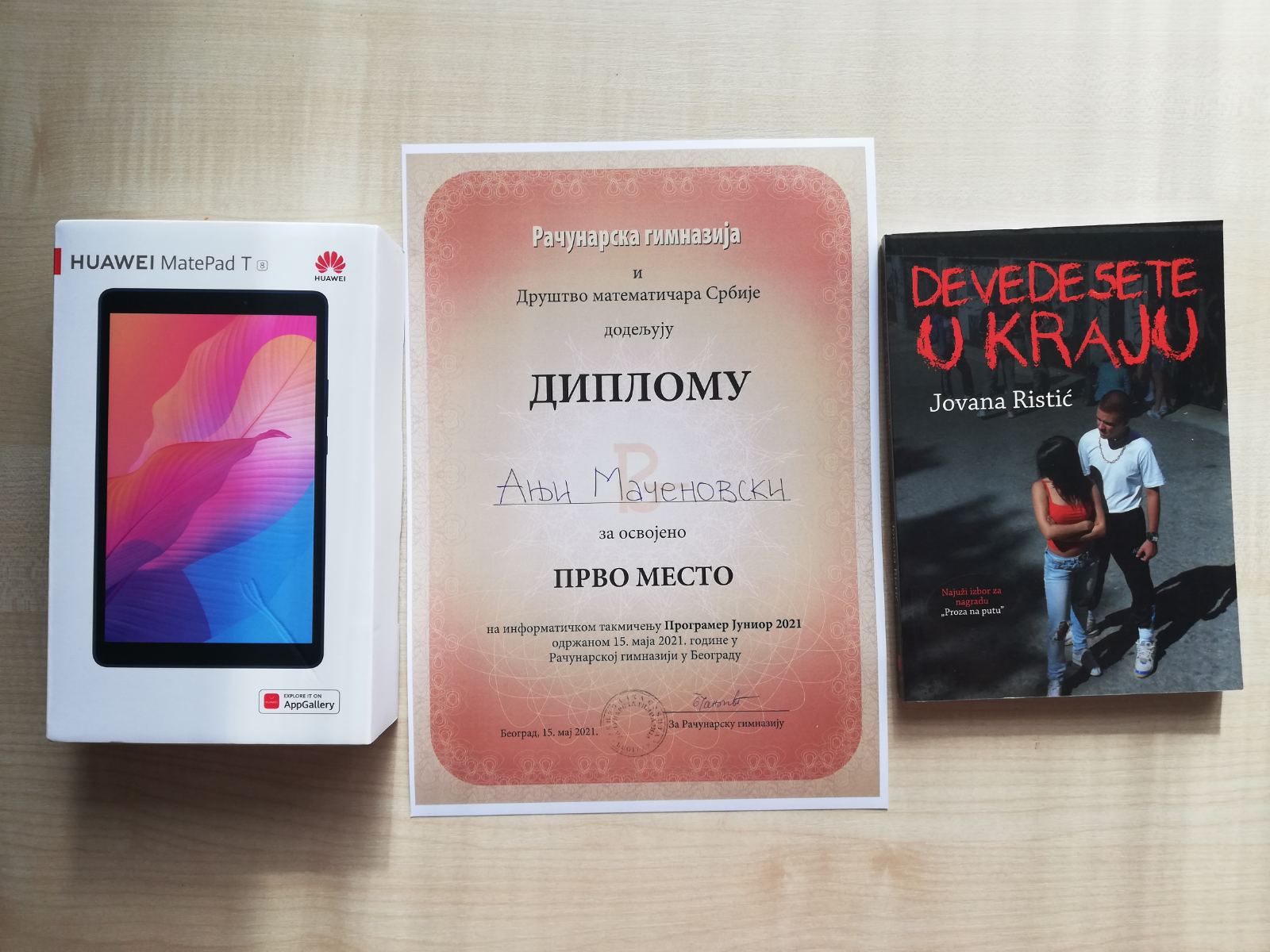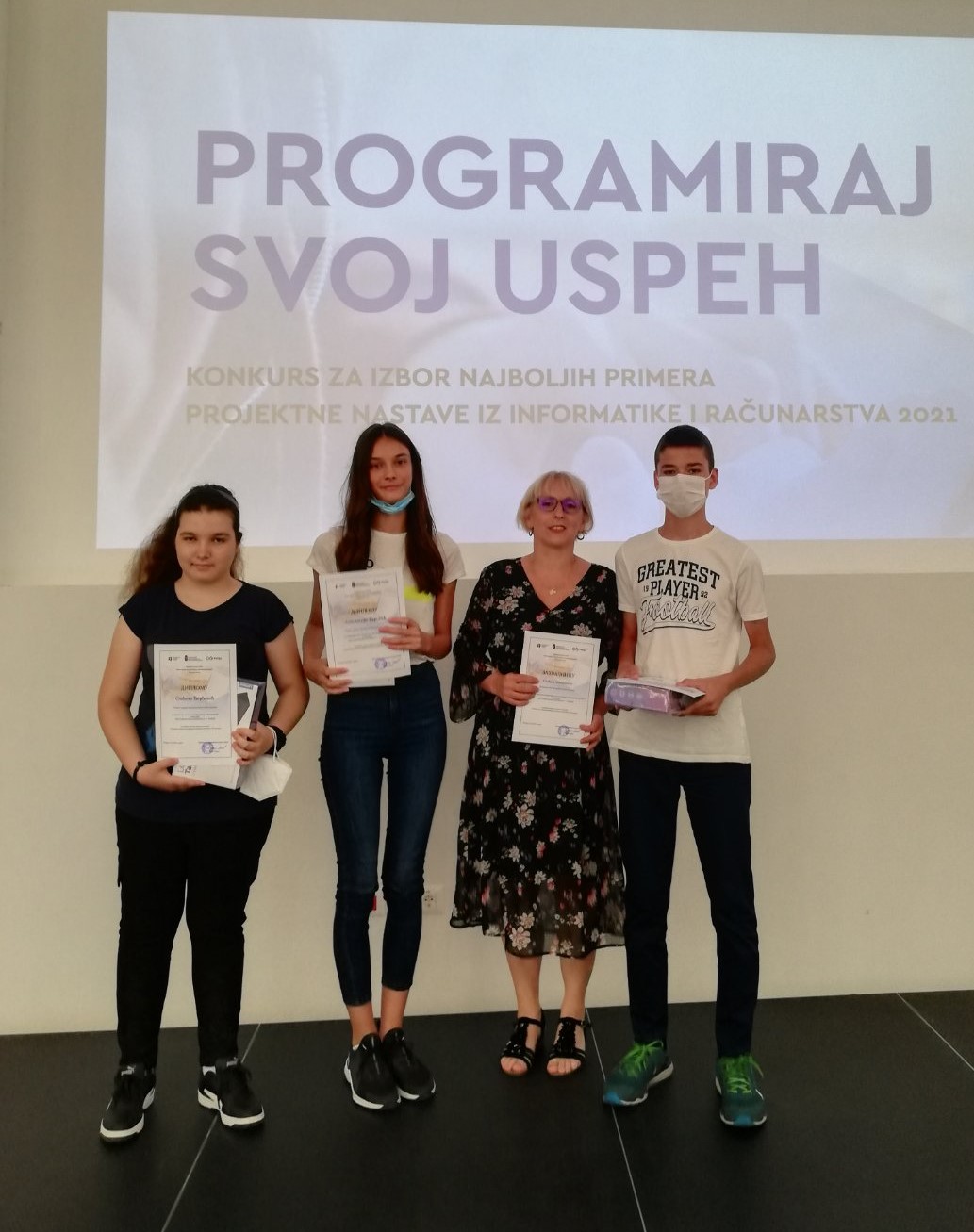 За освојено прво место, Александра и Ања су добиле и вредне награде: диплому, Huawei таблете и књиге, Илија и Огњен су добили књиге и сертификате о учешћу, док је наставница Слађана добила ваучер за бесплатно похађање курса програмирања.