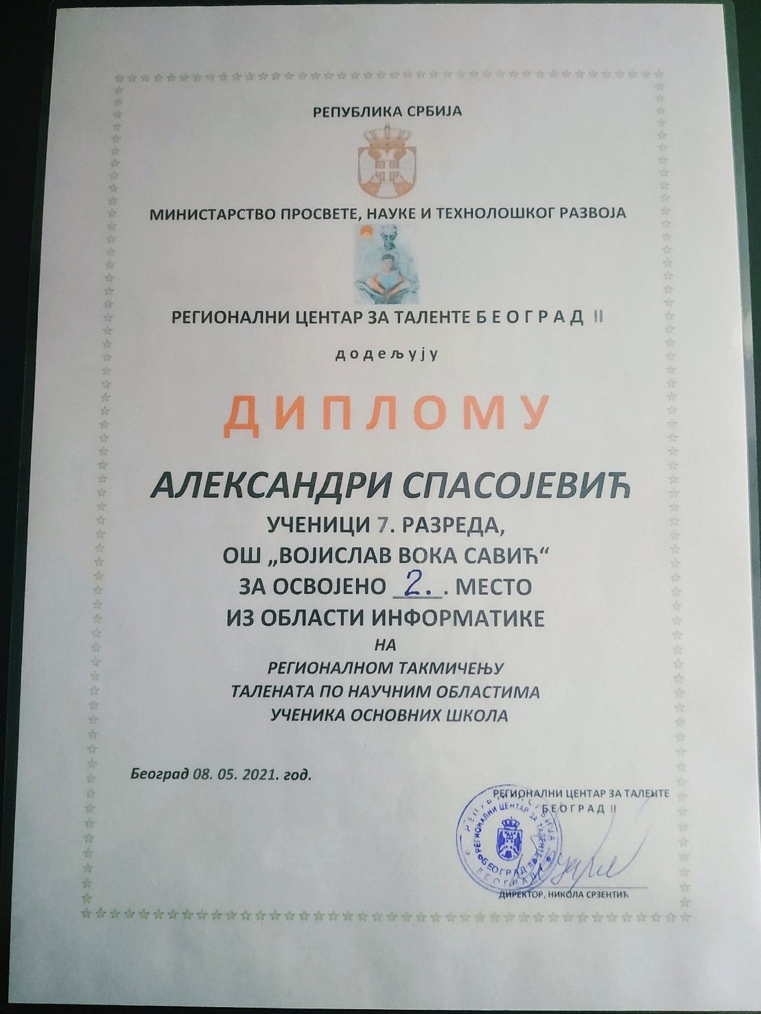Александра Спасојевић, ученица 7. разреда наше школе и полазник "Регионалног центра за таленте Београд II" остварила je изузетан резултат освојивши друго место на Регионалном такмичењу талената из области информатике и тиме се пласирала на државно такмичење талентованих ученика, које ће се одржати 22. маја 2021. године у Чачку на Техничком и Агрономском факултету.
