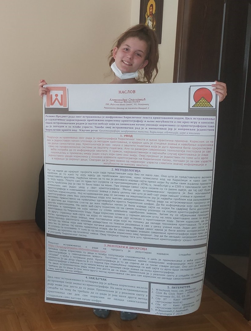 Александра се у свом истраживачком раду бавила криптографијом и њеном применом у свакодневном животу. Осмислила је јединствени крипто код на ћирилици. Поред тога је направила сајт који презентује њен рад као и разне игре и квизове. Честитамо Александри и желимо јој пуно успеха на предстојећем такмичењу.