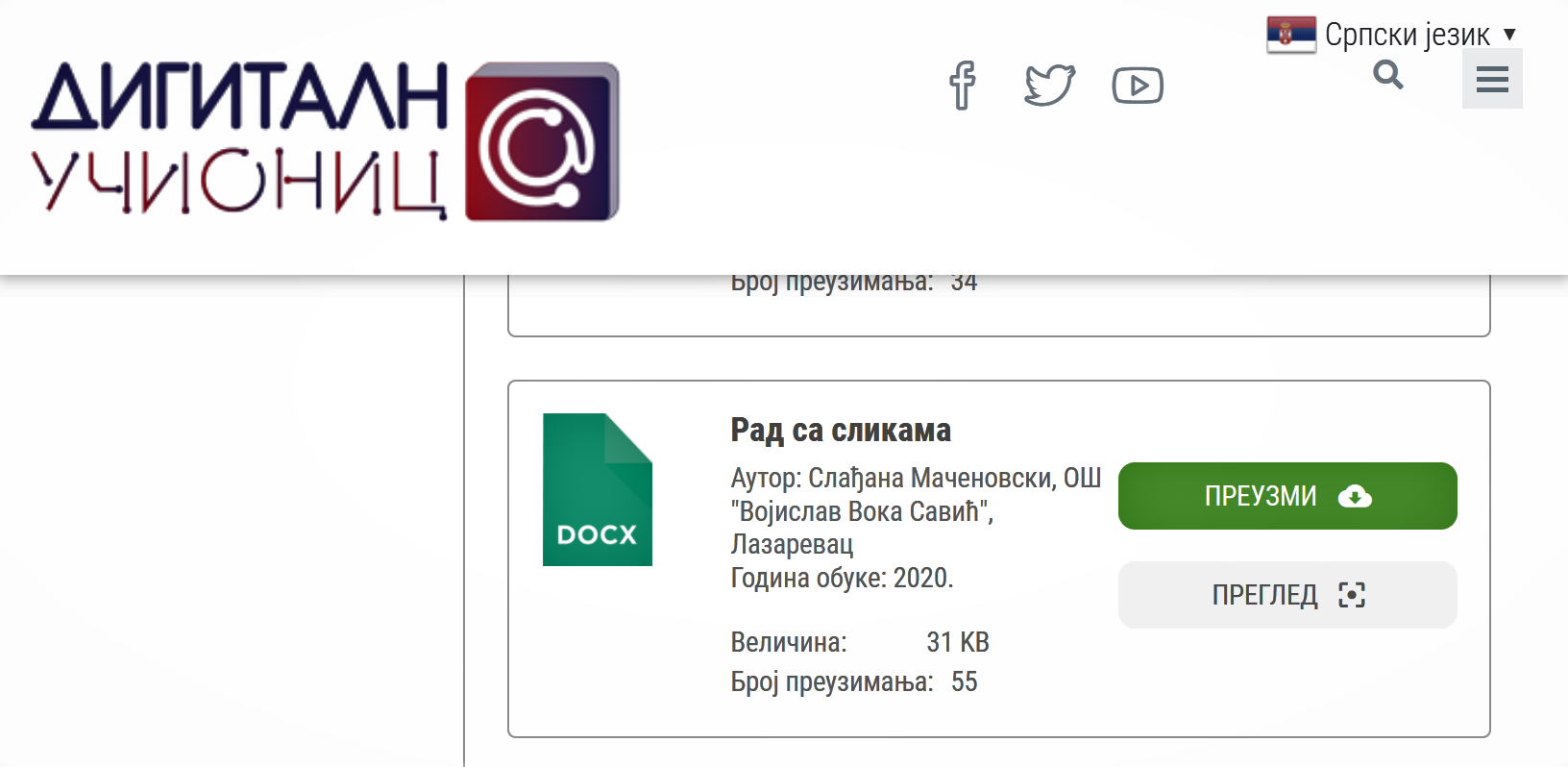 Ова база радова је креирана од најбољих радова насталих у оквиру обуке наставника „Дигитална учионица / дигитално компетентан наставник“, прописане од стране Министарства просвете, науке и технолошког развоја и Завода за унапређивање васпитања и образовања у циљу унапређења дигиталних компетенција наставника. Ови радови имају практичну и употребну вредност као предлози и идеје активности које наставници могу да спроведу у својој непосредној пракси.