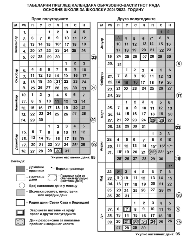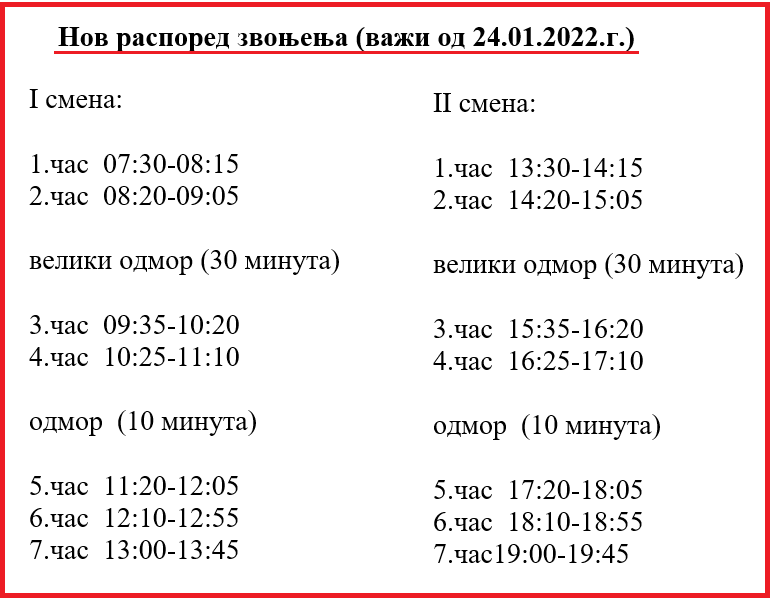 Настава у школској 2021/22.г. почиње у среду, 1.9.2021.г. Наставу ће похађати цела одељења, а часови ће трајати 45 минута.