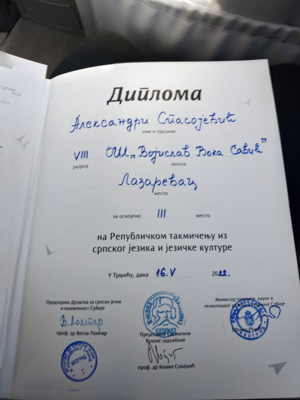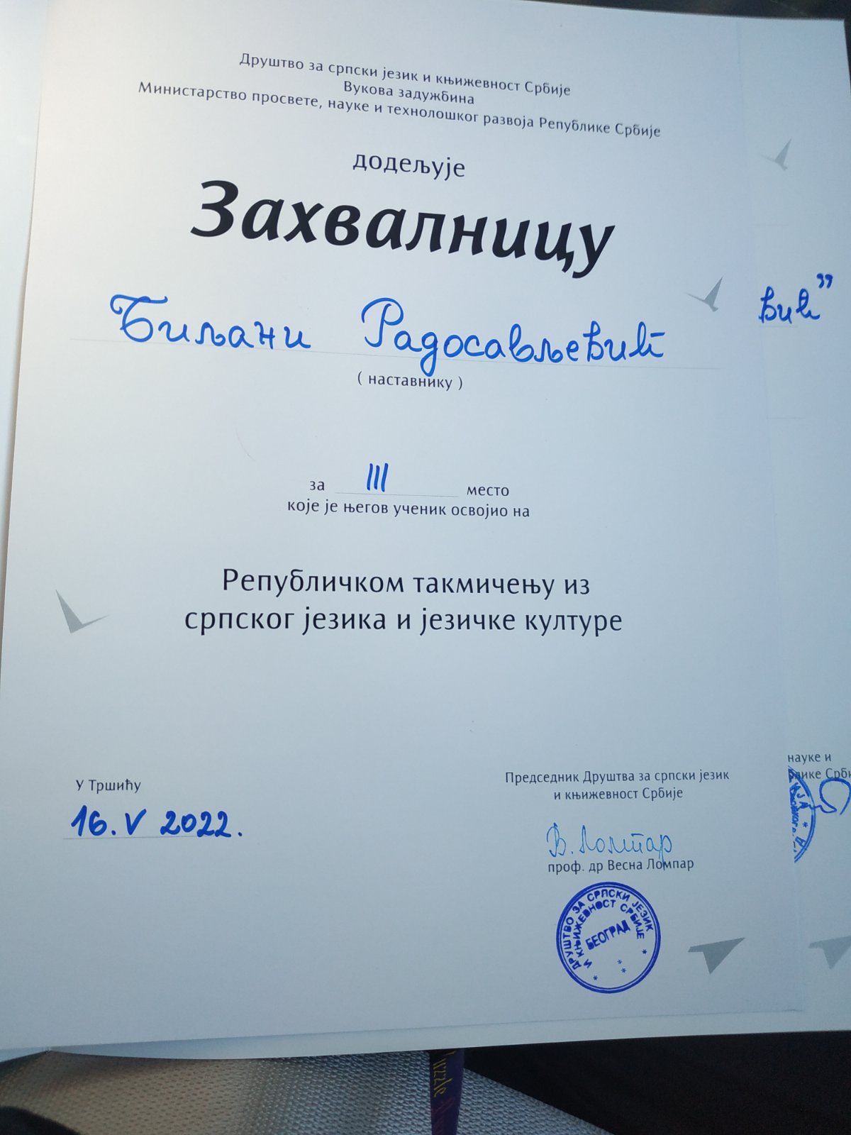 На Републичком такмичењу из српског језика и језичке културе одржаном 16.5.2022. у Тршићу, Александра Спасојевић, ученица 8/3, остварила је велики успех и освојила треће место. Међу 120 ученика осмог разреда, који су учествовали на највишем нивоу такмичења из матерњег језика, Александра се пласирала међу првих 15 ученика, освојивши 18 од 20 могућих поена на веома тешком и захтевном тесту.