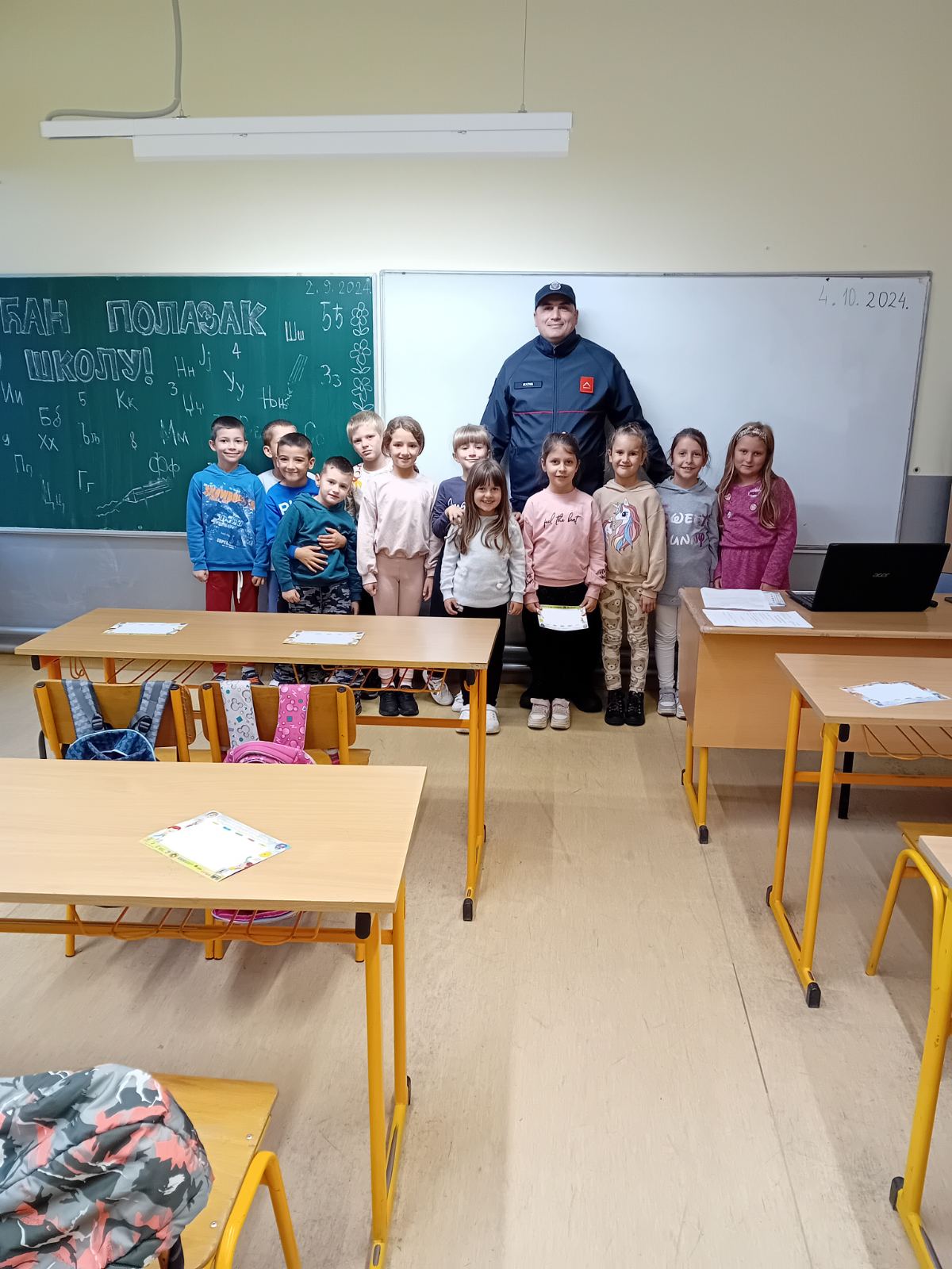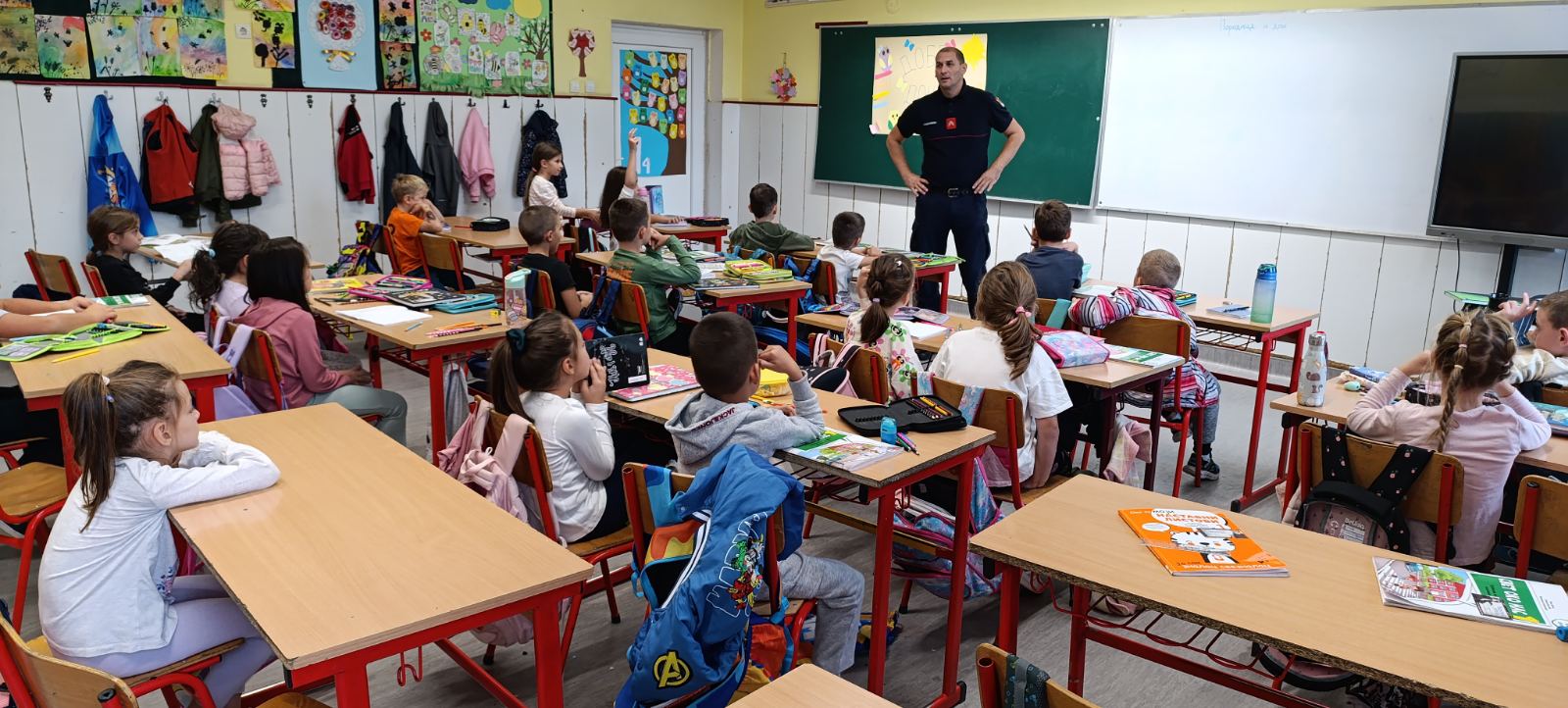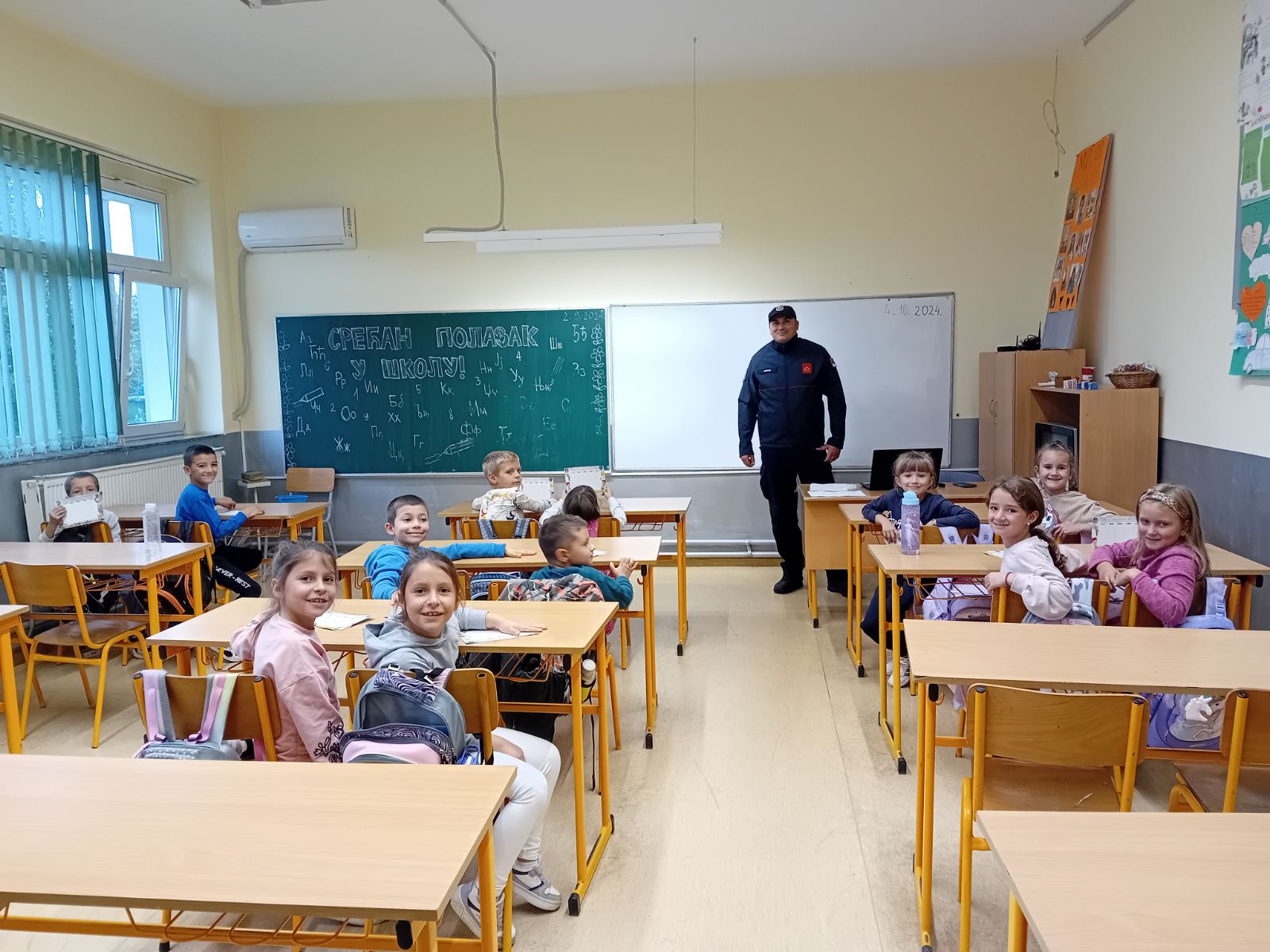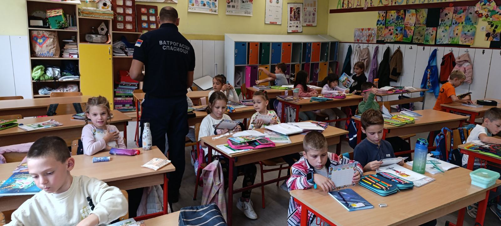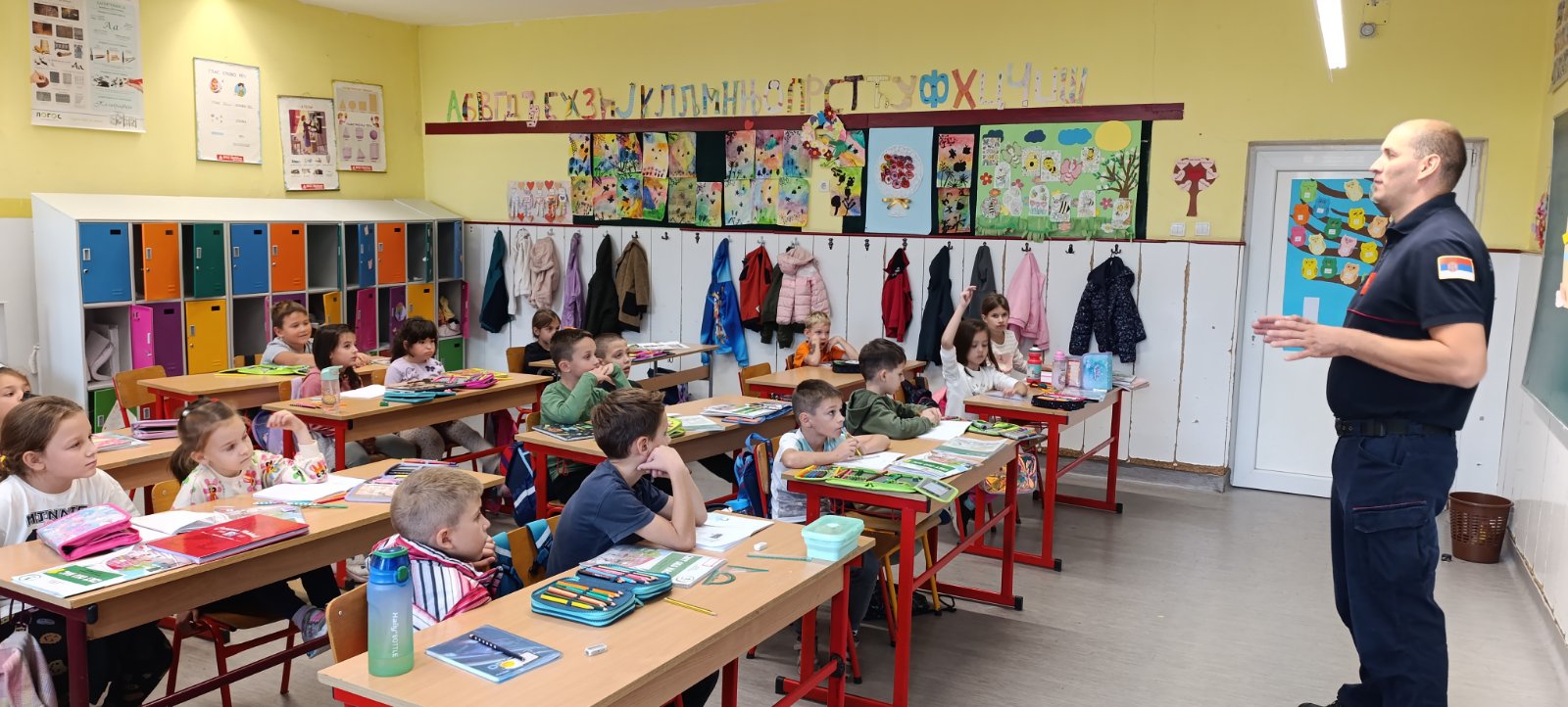 Ученици 1. разреда данас су слушали предавање ватрогасца у оквиру пројекта "Заједно и безбедно кроз детињство" на тему пожара, поплава и земљотреса. Ученици су учествовали у разговору, постављали питања и заинтересовано слушали савете.