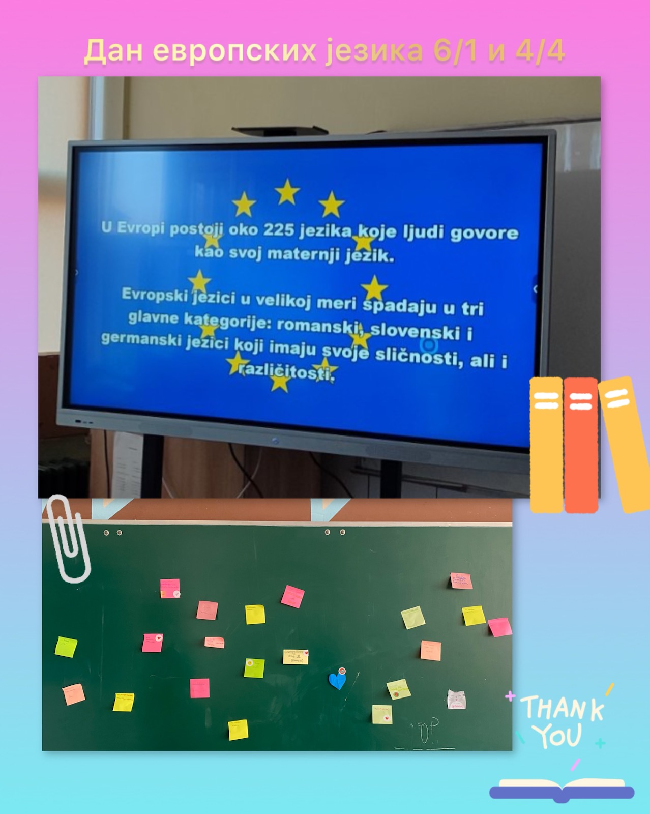 Овај дан обележили су ученици 6/1 који су посетили и однели поруке о пријатељству и поздраве на разним језицима ученицима 4/4. Истакнут је значај познавања више језика "Што више знаш, више вредиш!. Европски дан језика обележен је и у одељењима 6/2 и 8/3.